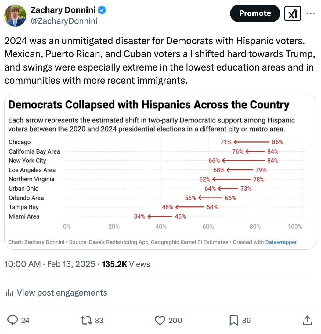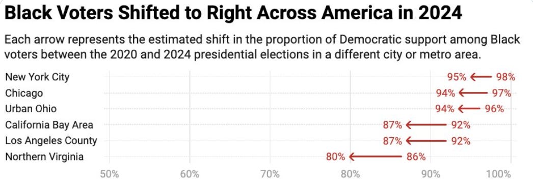 The biggest story of this election cycle is the mass exodus of Hispanic voters from the Democratic Party. With Hispanics as a growing voter bloc, the long-term implications are huge. In one night, they dashed a decade-long Democratic dream of flipping Texas, cemented Florida’s status as a solidly red state, and helped deliver Nevada and Arizona to the GOP. Beyond the direct electoral consequences, it’s also a bit of a rhetorical gut punch for the Democratic base. Since Summer 2020, much of the party’s evolution has focused on progressive racial messaging and the expansion of DEI initiatives. Yet, this shift has coincided with significant defections among voters of color, many of whom have moved toward Trump—ultimately prompting a reevaluation of these policies by corporations and the executive branch in the weeks after Trump’s inauguration.