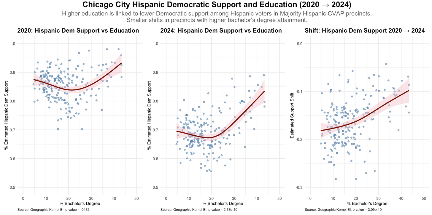 We’re also starting to see the early signs of educational polarization among Hispanic voters. Historically, there’s been a U-shaped relationship between education levels and Democratic support among Hispanics in northern/western cities—Hispanics in both the least and most educated areas were the most Democratic. But that pattern is beginning to break down, with the shifts now looking pretty linear as Democratic support declines the most with the lowest education voters and vice versa.