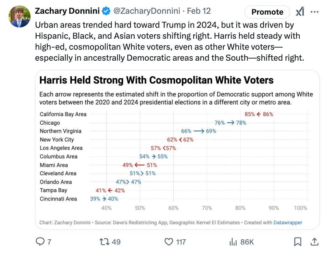 Another major story from this election is how well Democrats performed with highly educated, cosmopolitan white voters. In particular, Democrats excelled with white city dwellers. While urban areas overall trended right, that shift was largely driven by minority voters. Among white urban voters, Harris actually performed quite well.
