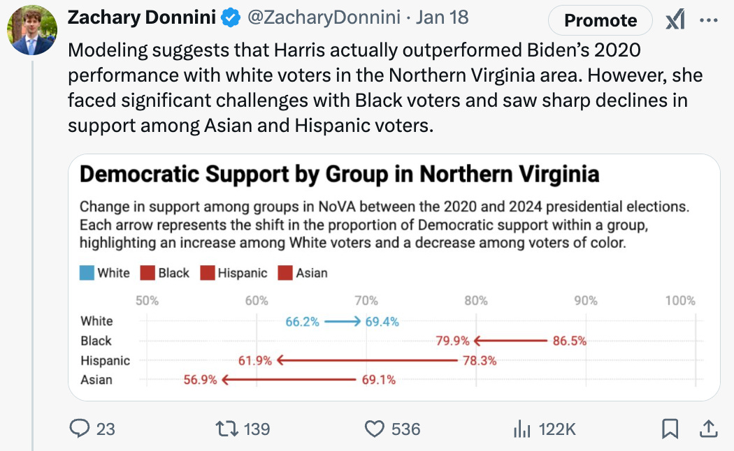 We’re reaching a point where white voters in many affluent suburbs are more pro-Democratic than Hispanic and Asian voters. In Northern Virginia’s DC suburbs, for example, white voters collectively backed Harris at higher rates than people of color in the same region. Aside from Black voters, White voters were actually the most Democratic group.