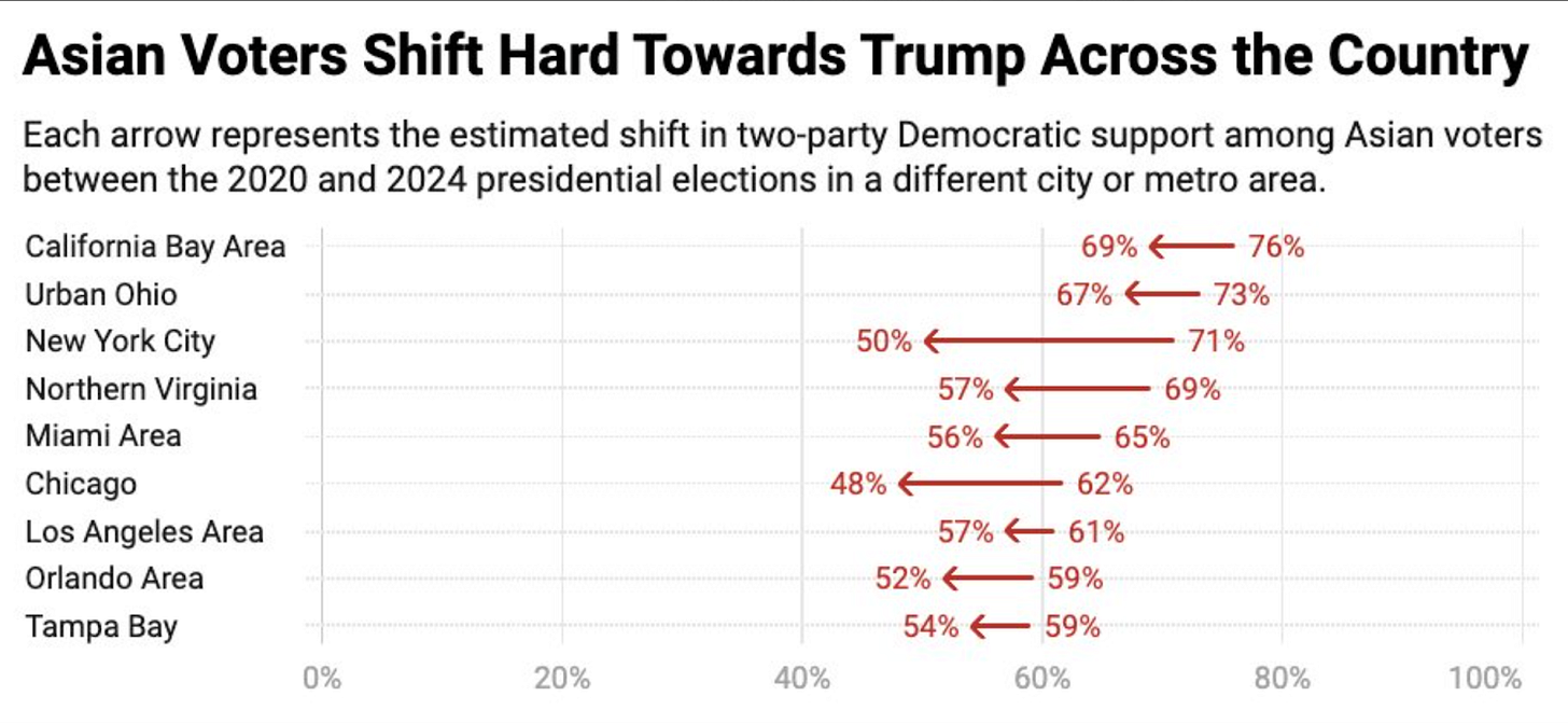 Regionally, the shifts align with expectations. They are much larger in areas with more working-class Asians, such as NYC and Chicago, and somewhat larger in places with higher South Asian populations, like Northern Virginia, Columbus, and Raleigh. In California, where the Asian population is predominantly affluent Korean and Chinese—especially in the Southland—the shifts to the right are noticeably smaller.