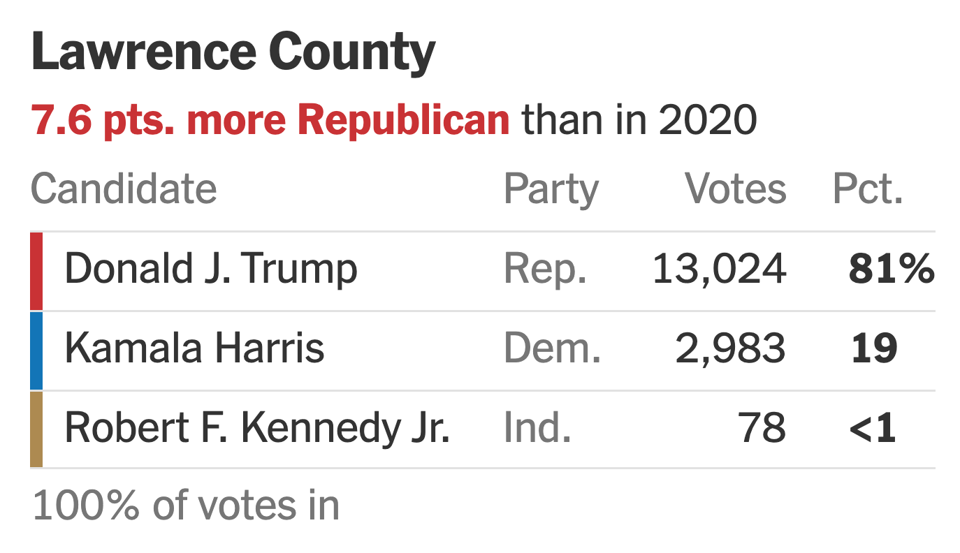 Republicans made big gains in historically Democratic areas that have been trending GOP for years, but 2024 was the year the bottom truly fell out for Democrats in a lot of these places. The Driftless Area in northeast Iowa and southwest Wisconsin, the coalfields of West Virginia and Kentucky, and southern white rurals and small towns that had already been shifting right all swung hard to the GOP. Nationally, Trump clearly performed better with white voters in 2024 than in 2020, driven largely by these kinds of areas. Lawrence County, AL, is a perfect example—already deep red and somehow getting even a lot redder.