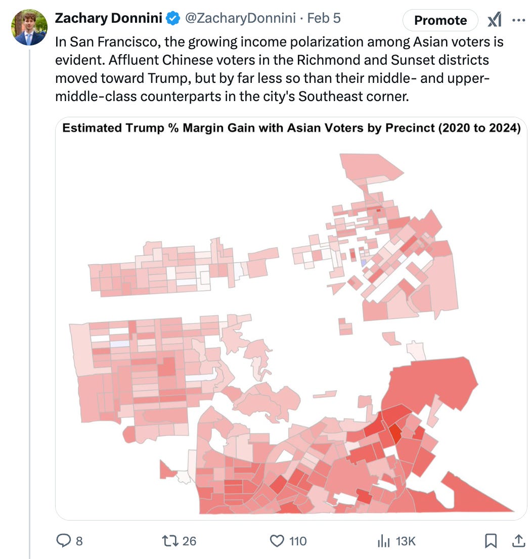 A map of Asian shifts in San Francisco nicely highlights growing educational polarization among Chinese voters. Wealthy Asians in the Inner Richmond district barely shifted toward Trump for example, while middle-class Asians in the city’s southeast corner swung heavily to the right.