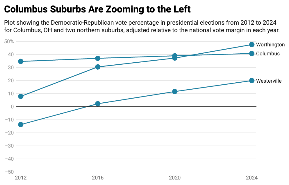 But in many suburbs, Democrats did exceptionally well with white voters. Take the Columbus suburbs, for example. Worthington just passed Columbus in Democratic support, and at this rate, Westerville is on track to be more Democratic-leaning than Columbus by 2032. It’s genuinely mind-blowing, even as someone who’s only followed politics closely for a decade or so. The same trend holds across much of the Midwest and beyond—suburbs around Omaha, Kansas City, St. Louis, Milwaukee, Indianapolis, Louisville, Cincinnati, Raleigh, Pittsburgh and Charlotte all showed similar patterns. Worthington and Westerville are perfect examples of the type of place that Democrats are doing great in—white voters around the 80th national income percentile are trending hard to the left. Once you move above that into ultra-wealthy areas like Greenwich, CT; Alpine, NJ; Sands Point, NY; and Beverly Hills, CA, Trump actually performed quite well. But in upper-middle-class suburbs, Democrats are doing well.