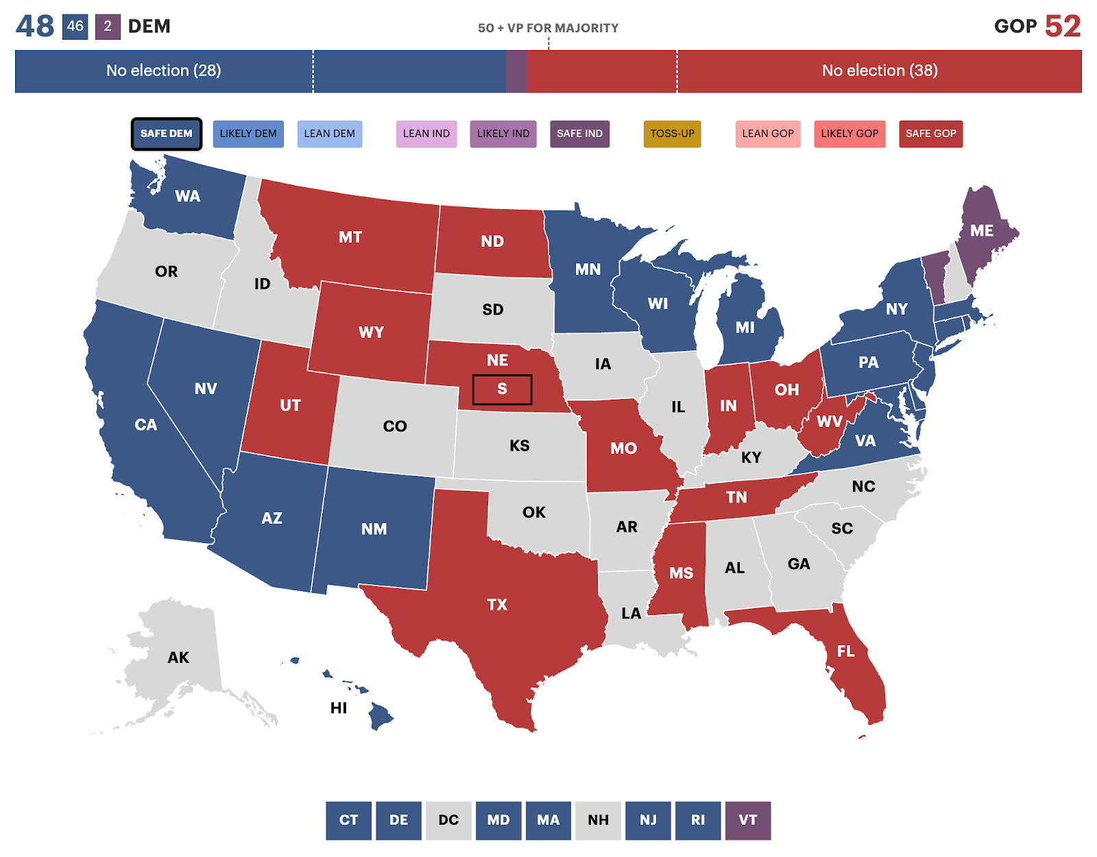 I think Republicans hold FL and TX and flip MT by pretty healthy margins, which gives them 51 seats and control of the chamber.
