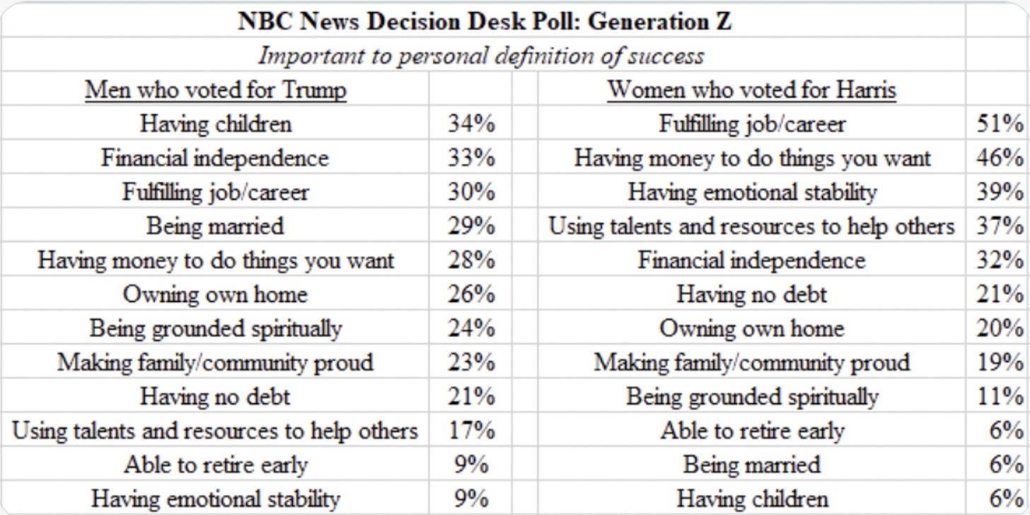 The underlying drivers of these trends and preferences to me are not especially mysterious. Much of this appears downstream of the long-running divide between feminist norms and family-centered values. Liberal women, on average, are now very, very likely to embrace the idea that fulfillment should be defined independently of their “traditional” role of marriage and motherhood, a view that has become increasingly dominant in the last half-century. It is therefore not surprising that young liberal women, having internalized these norms, place less value on marriage and childbearing, marry at lower rates, and ultimately have fewer children. This outcome seems like a fairly natural consequence to me of stated preferences and social incentives. There is good survey evidence supporting these dynamics, including some recent polling work from NBC and this cool poll on dating from Daniel Cox.