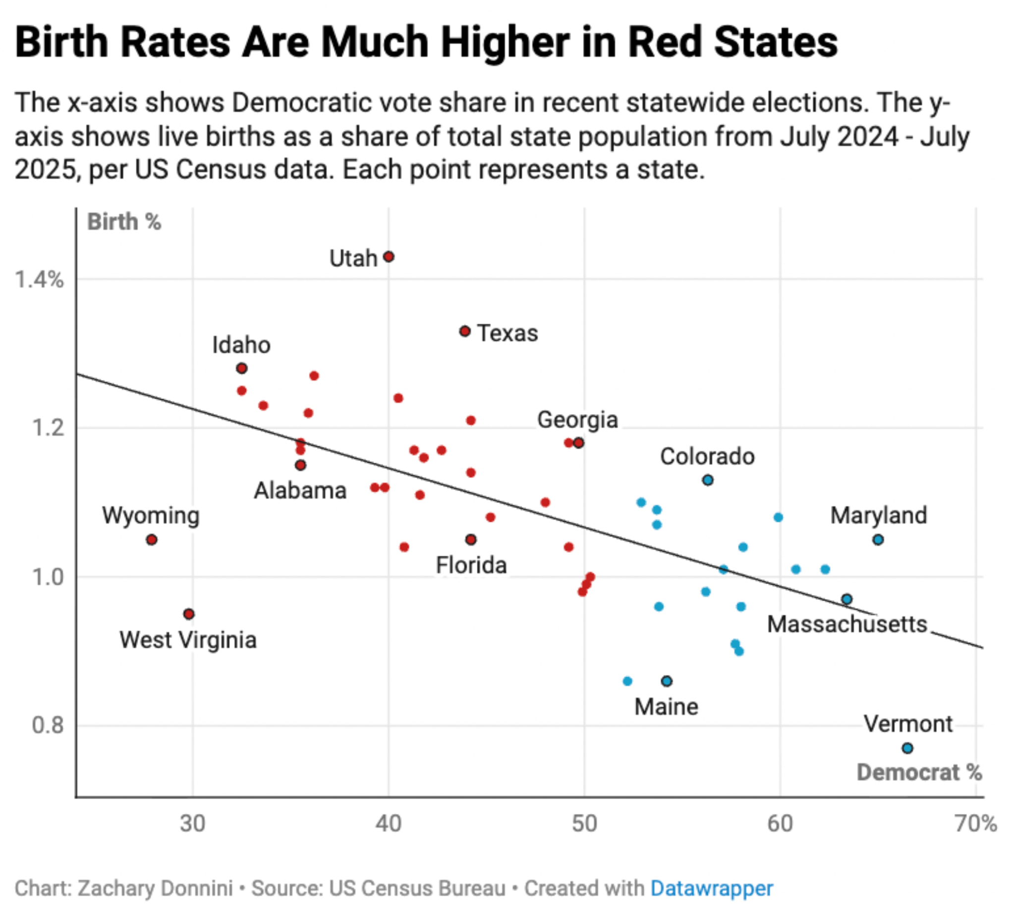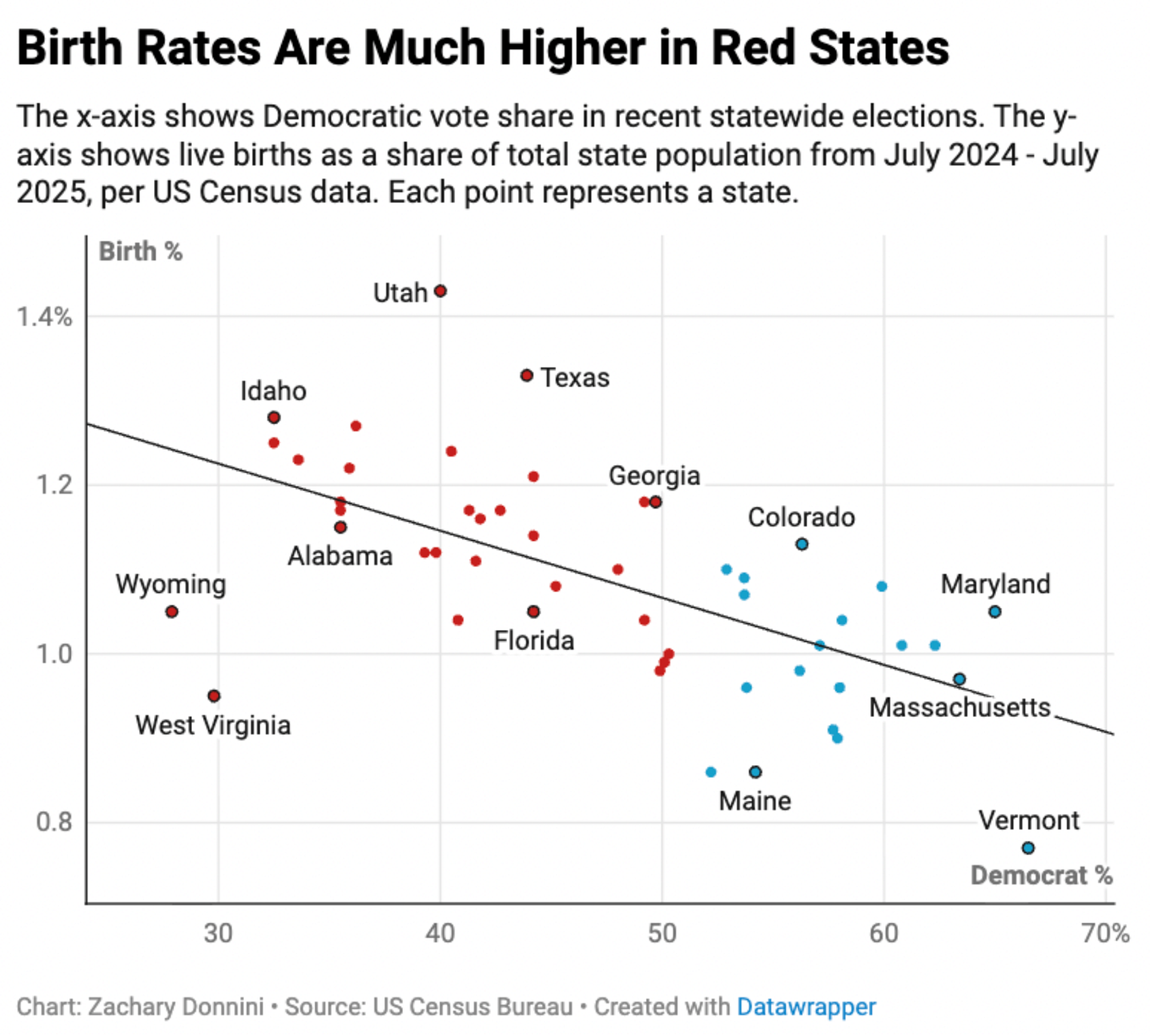I’m well aware that state-level data is not always the cleanest unit of analysis, and I would not present a plot like this and imply it’s evidence of an individual-level relationship without more granular data to support it. That said, with the release of the new 2025 U.S Census Bureau population estimates this week, it’s worth noting that fertility rates in Republican-leaning states are substantially higher than in Democratic-leaning states. The relationship is pretty strong. The correlation between Trump vote share and fertility at the state level is now 0.84, up from 0.79 last year, which is unusually high for demographic data of this kind.