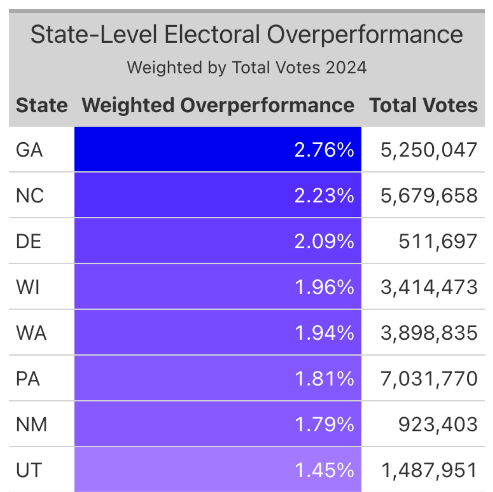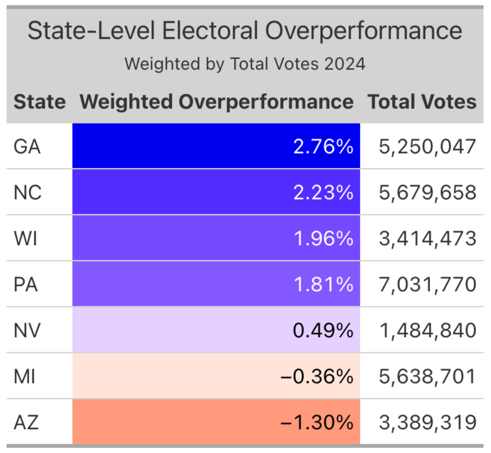 Harris generally overperformed the demographic model’s expectations in key swing states. Of the seven major battlegrounds, four ranked among her top six state-level overperformances. This pivotal dynamic neutralized much of the GOP’s remaining systemic edge, setting up a notable realignment in presidential politics.