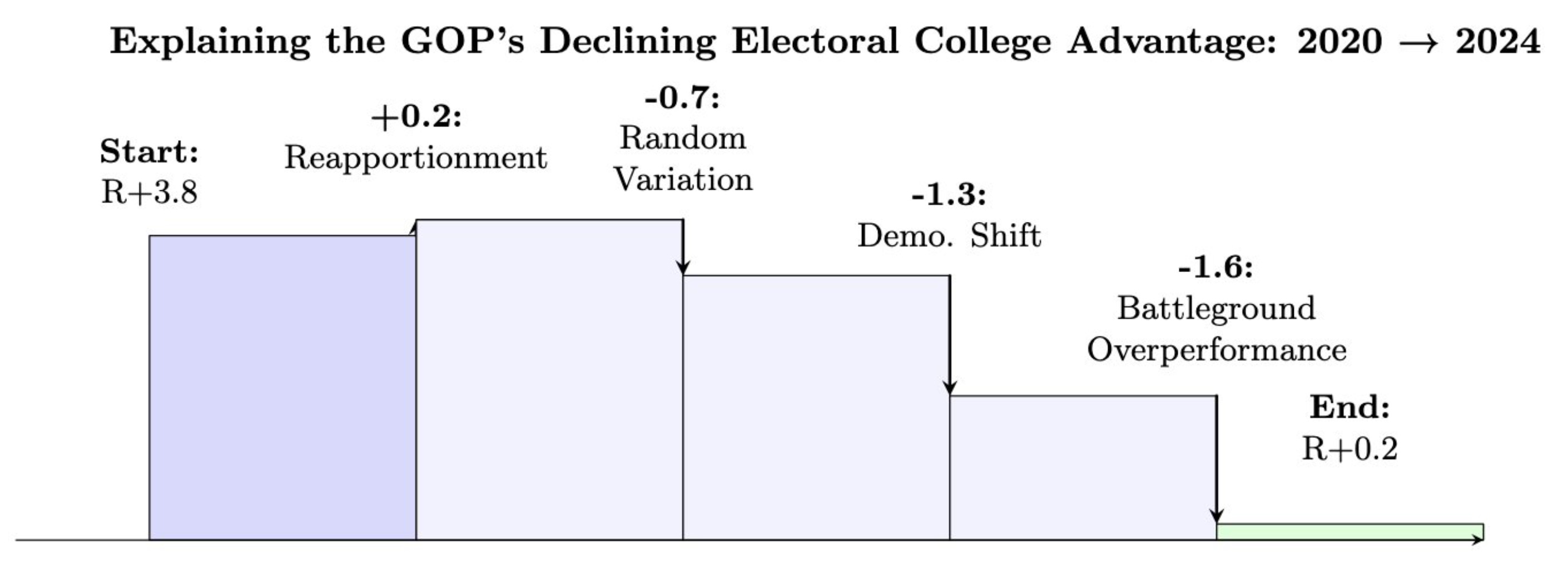 In short, after 2024’s extraordinarily tight outcome, the Electoral College bias for Republicans—once as high as 3.8%—is now much narrower. Future cycles will bring further state-by-state fluctuation, continued demographic changes, and reapportionment-induced realignments. Given those layers of volatility, neither party can bank on a sizable Electoral College advantage in cycles to come, but it is certainly possible that one develops.