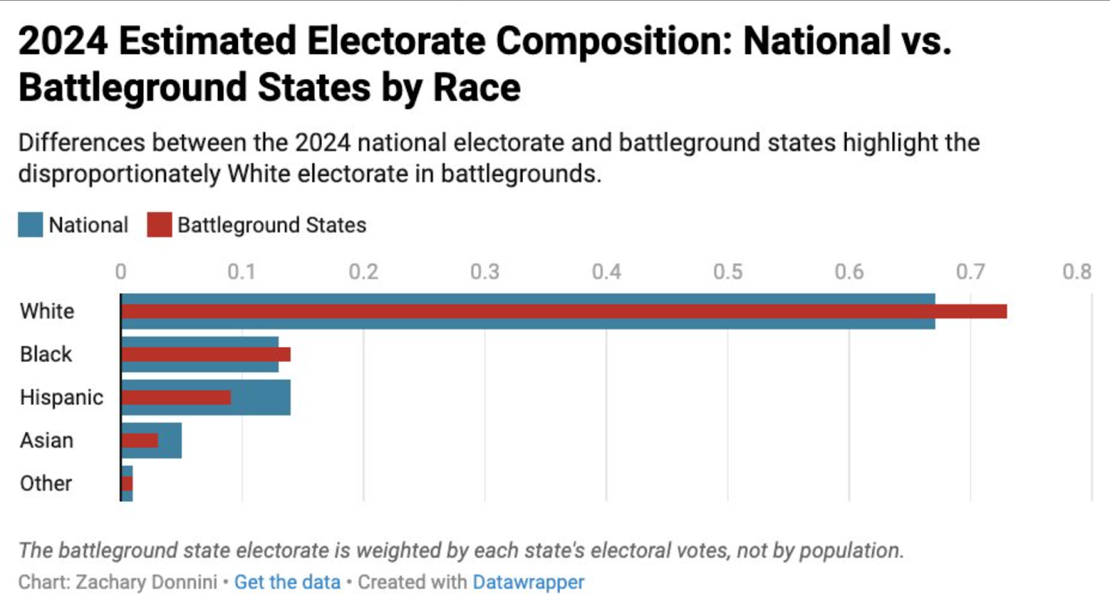 When I attempt to explain Vice President Harris’s resounding success in key swing states such as Georgia, North Carolina, Wisconsin, and Pennsylvania I come up with two primary factors. First, her campaign’s substantial financial advantage enabled a highly coordinated strategy that combined targeted advertising with robust ground operations, which proved particularly effective in these pivotal states. This advantage not only allowed for precise voter outreach but also contributed to improved Black voter turnout relative to 2020 in these key states, especially when compared to lower turnout in states such as South Carolina, Mississippi, and Alabama. This disparity highlights the strategic deployment of resources to mobilize key demographic groups in areas where their participation would have the greatest impact. Second, Harris’s supporters, who generally exhibited more moderate levels of enthusiasm compared to the fervor seen among Trump voters in polling, may have been especially motivated to turn out in battleground states. This heightened engagement likely stemmed from the perception that their votes would carry significant weight in determining the outcome of the election, underscoring the critical role of these states in shaping the broader electoral landscape. Either of these factors may be the entire reason, or maybe I’m missing something and there’s a third reason, but these are the two that comes to mind for me.