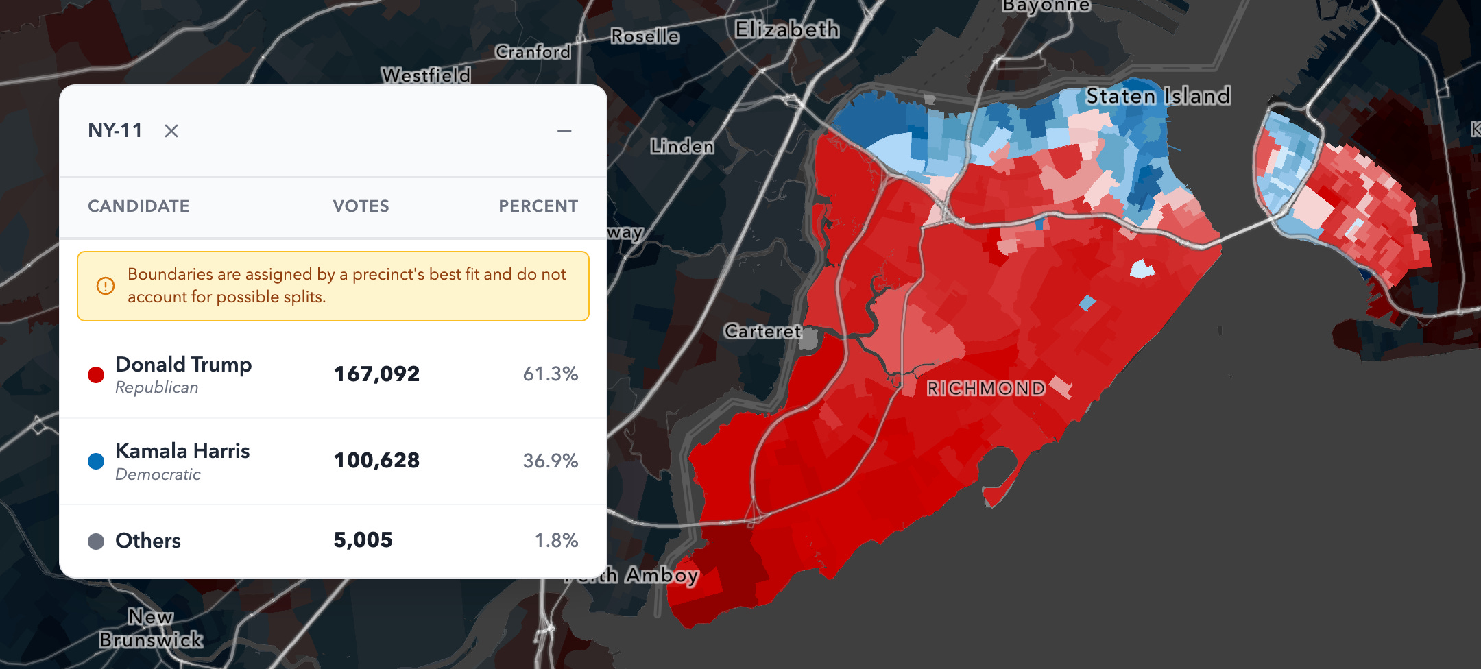 NY-11 is a heavily Republican district centered on Staten Island. In 2024, it was Trump +25, and the district is about 54% White. Politically, the geography is also straightforward: Southern Staten Island is extremely Republican, northern Staten Island is more diverse and votes more Democratic, and the portion of Brooklyn included in the district (Bay Ridge, Dyker Heights, and Bensonhurst) is mixed.