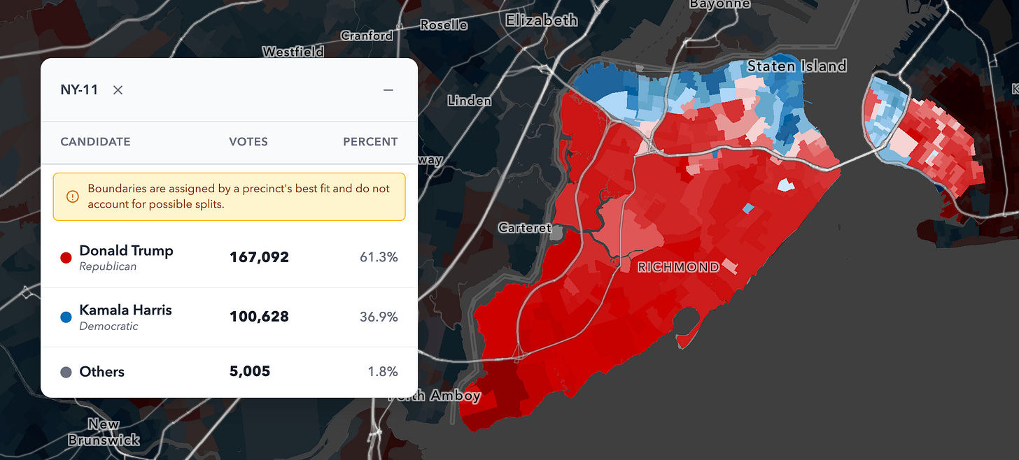 That should not be surprising given broader national trends. Hispanic and Asian voters have shifted noticeably toward Republicans over the past eight years, and in 2024 they were not overwhelmingly Democratic groups nationally. NY-11 is also a Trump +25 district, so it would be unusual for the district’s non-Black minority groups to vote like they do in a place like San Francisco.