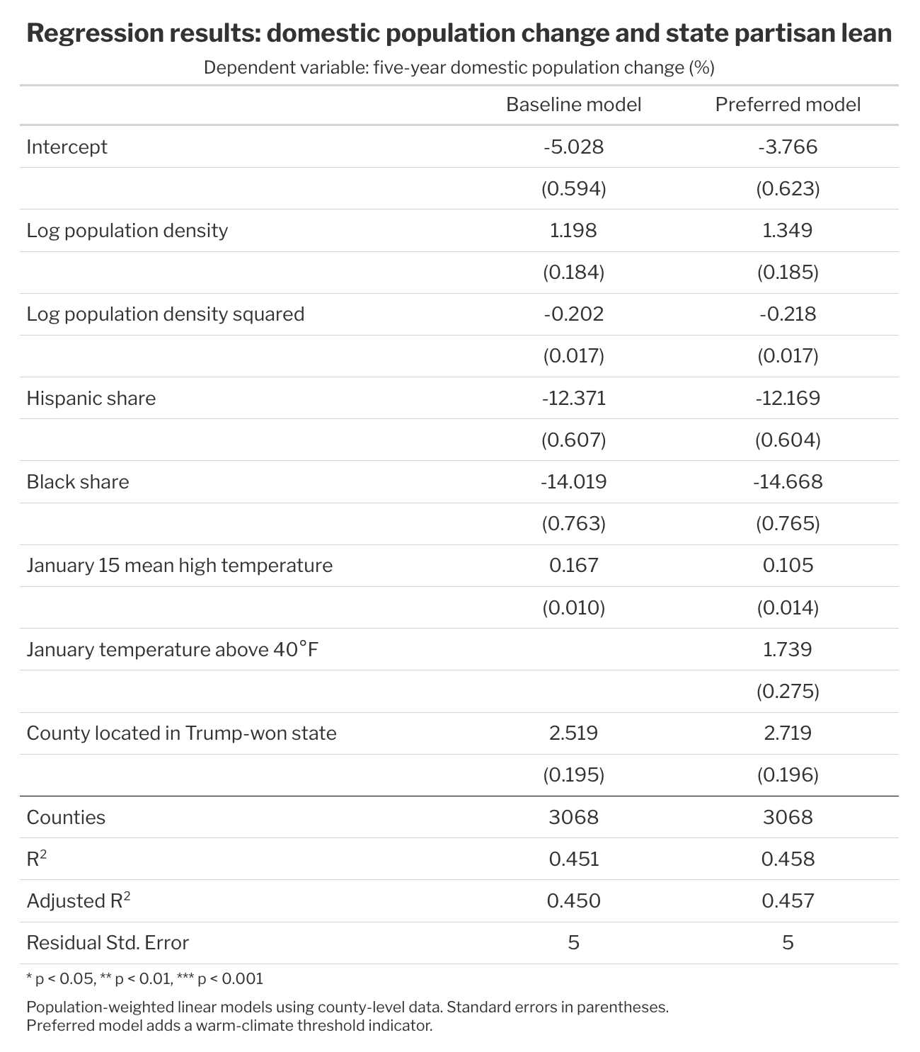 Using county-level data, I examined domestic population change while accounting for several of the most commonly cited drivers of migration. I incorporated local climate by collecting average January high temperatures for every county, controlled for development patterns using population density (measured as median weighted census block group density), and accounted for demographic factors. These adjustments capture much of what we would expect to explain migration trends: people tend to move toward warmer, less dense areas, and population change varies meaningfully across demographic compositions.