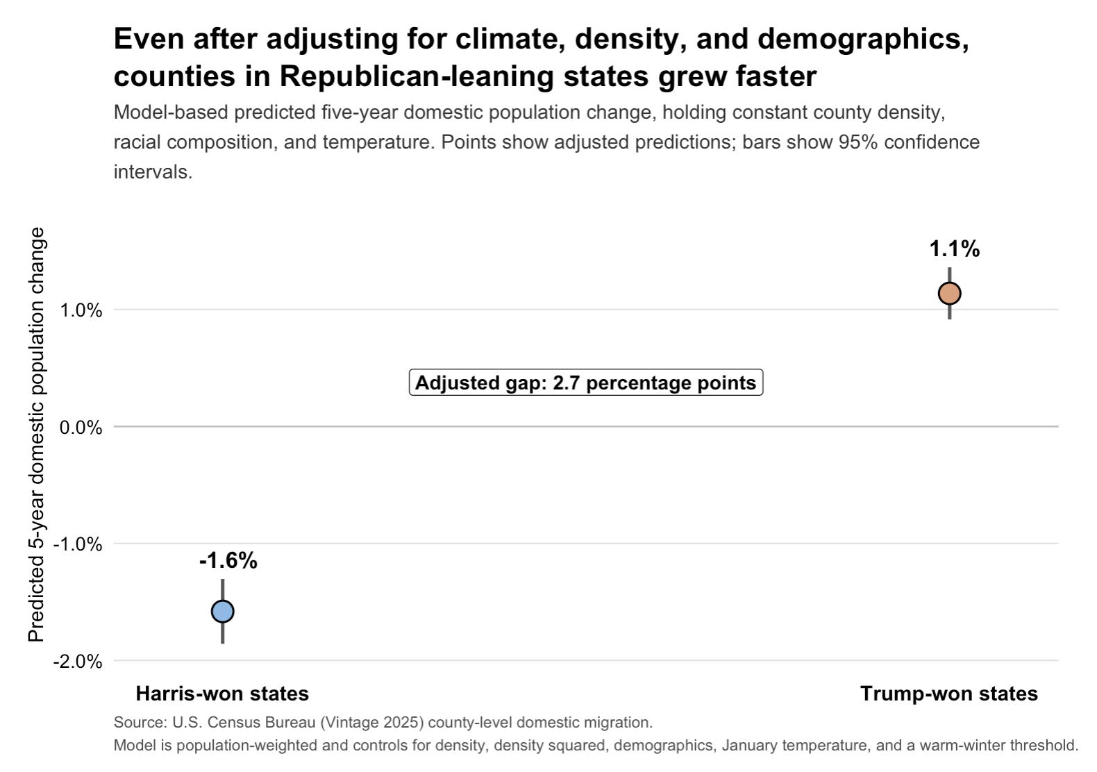 Even after accounting for climate, density, and demographics, a substantial gap remains. Figure 1 shows the model-implied difference: counties in Trump-won states were still predicted to experience roughly 2.7 percentage points more domestic population growth over the past five years than otherwise similar counties in Trump-lost states. That does not, by itself, establish that partisan governance is the cause. But it does suggest that the divergence is not simply a story about warm weather, suburbanization, or demographic composition more broadly.