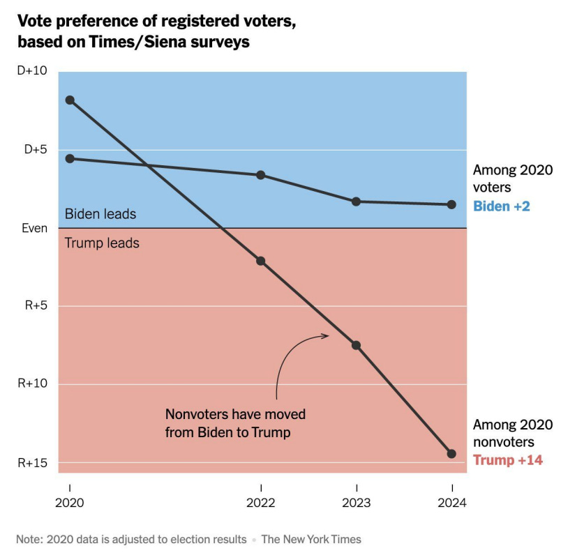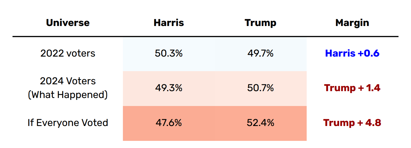 David Shor of Blue Rose Research estimates that if every eligible voter had cast a ballot in 2024, Trump would have defeated Harris by about 5 points, rather than the actual margin of 1.4. In other words, the race was only close because many conservative-leaning voters — particularly those with lower turnout propensity — stayed home. One particularly striking detail from the same analysis: the 2022 midterm electorate was roughly two points more Democratic than the 2024 electorate, despite 2022 being a relatively strong cycle for Republicans, who gained seats in the US House as the opposition party.