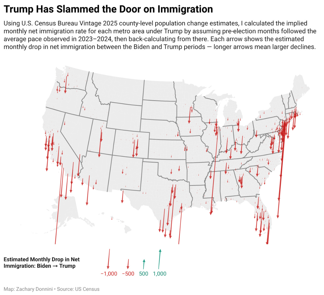 For now, the early evidence indicates Trump is, in fact, successfully limiting migration. Preliminary estimates suggest that net international migration has fallen sharply, to levels well below those observed in recent years. While it remains too early to draw definitive conclusions about what will happen over the remainder of Trump’s term, the initial data indicate that policy changes are already having a measurable impact on overall migration flows.