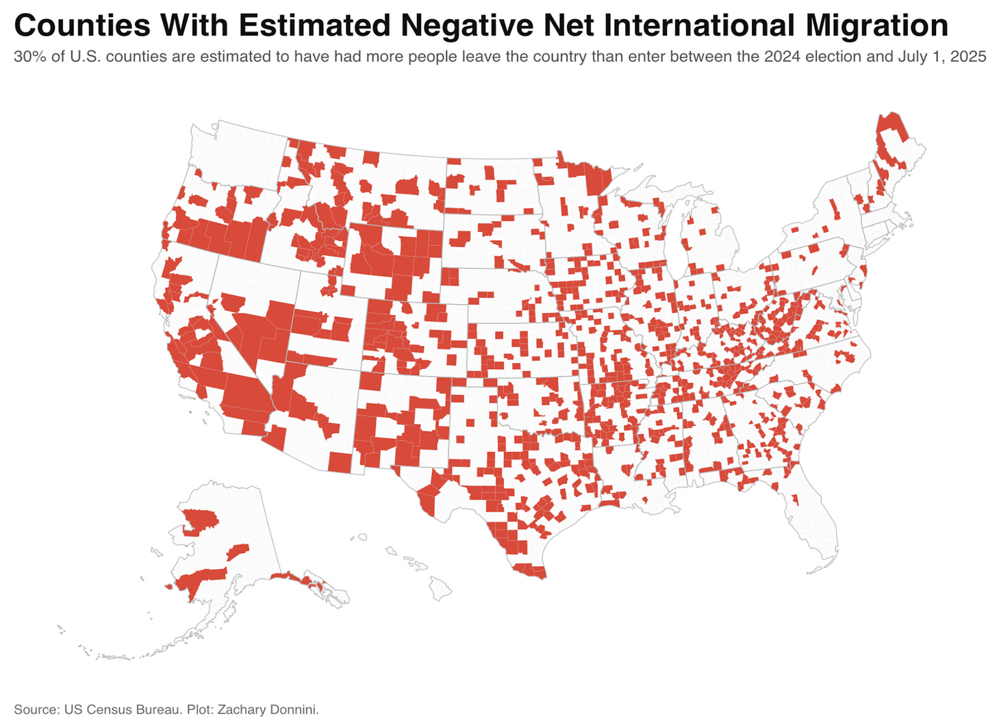 My estimates point to a substantial and widespread decline in net international migration, suggesting a meaningful shift in population dynamics