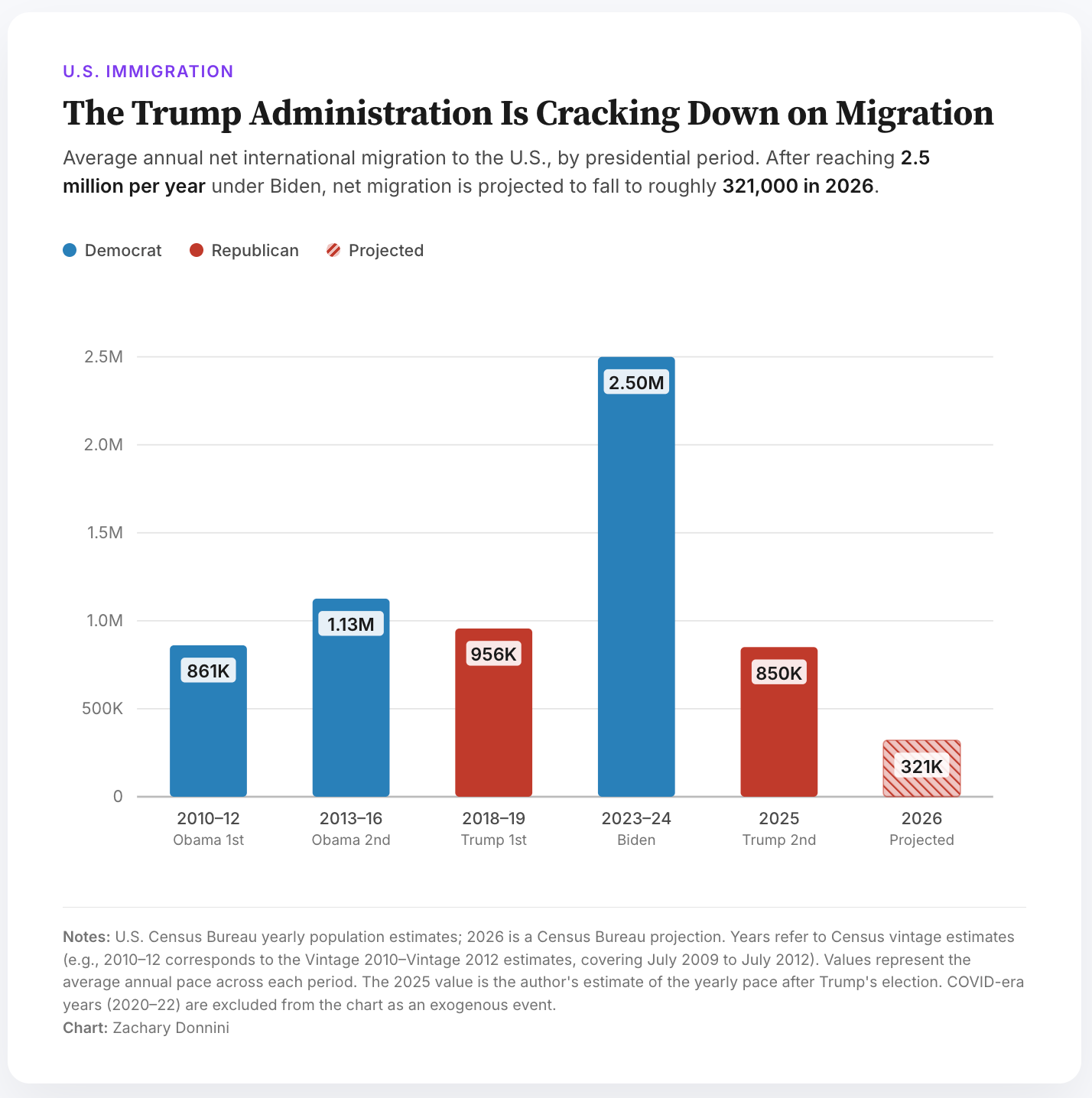 The more definitive test will come with the next data release. The Vintage 2026 estimates, expected to be released in early 2027, will be the first to capture a full year under current conditions, covering the period from July 1, 2025 to July 1, 2026. I expect a continued sharp decline in net international migration, a view that aligns with U.S. Census Bureau projections.